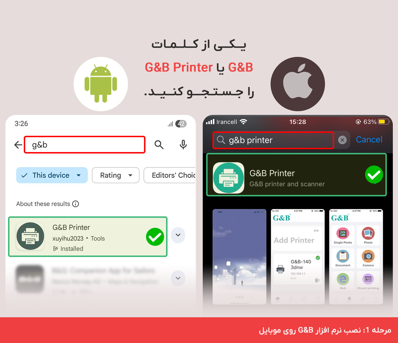 - با جستجوی کلمه G&B یا کلمه G&B Printer اپلیکیشن چاپگر را پیدا کنید. (به شکل و نام توسعه دهنده دقت نمایید).